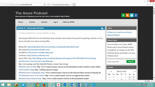 On March 12, 2014 I was the featured guest on the Azure Podcast Episode 19.